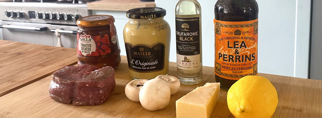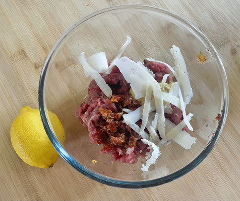 To prepare - finely dice the fillet steak, sun dried tomatoes and mushrooms, placing in a bowl. Add the oil, mustard and Worcestershire sauce. Add thin slices of the parmesan cheese ( potato peeler ideal for this ) and finally season. DO NOT add the lemon juice at this stage.