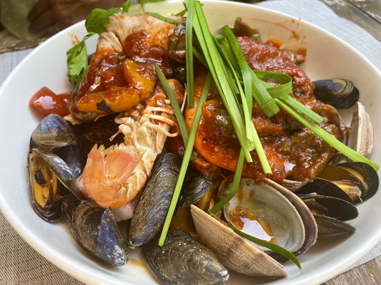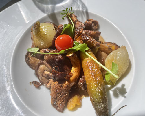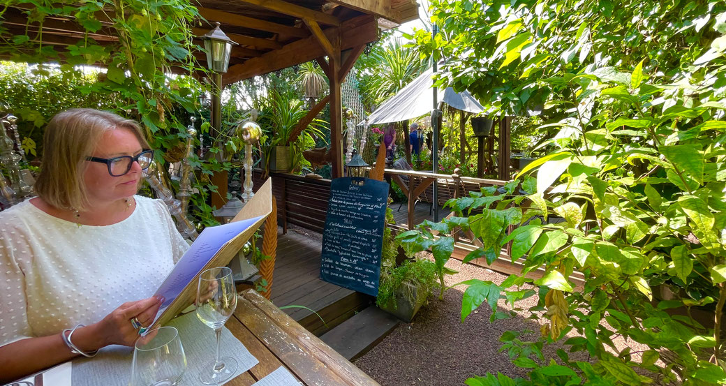 Mont-Saint-Michel 5 years ago. Having visited annually, we again visited this August on a very hot day. The car park gives you a view of Mont St.Michel over the salt marshes, with entry into this quirky restaurant from the main street. In winter there are a number of small rooms to dine in, each decorated with a variety of bric-o-brac. But our favourite time to visit is in summer, where it is possible to eat in the sub-tropical garden. Since our first visit we noticed how much the garden has grown. The staff are very friendly and attentive offering us an aperitif whilst we viewed the black board menu that they bring to you. There is a 28.00€ menu, but this is limited and the menu steers you towards the à la carte choices, which has a range of meat, fish dishes and salads. The menu is a range of French classics some with an Asian twist. For our main course, Helen enjoyed a Ttoro of Tuna and shell fish, a traditional Basque dish not dissimilar to a Bouillabaisse and I had the Beuchelle à la Tourangelle which is an ancient classic originating in Tours. Pan friend veal kidneys and sweetbread in cognac, wild mushrooms, root vegetables in a cream sauce. Delicious if you enjoy offal. We shared a dessert which was beautifully presented, fresh and light. The restaurant has a comprehensive wine menu, though prices seemed on the high side ranging from 40.00€ upwards. We are more than happy drinking a Muscadet and found a bottle for only 20.00€ on the menu. With the cost of aperitifs, entrees, main courses, dessert and wine the final bill is not cheap. Though this is not a restaurant you are going to visit daily, so for a special occasion the extra cost was still very worthwhile to enjoy the excellent food in a very pleasant setting.